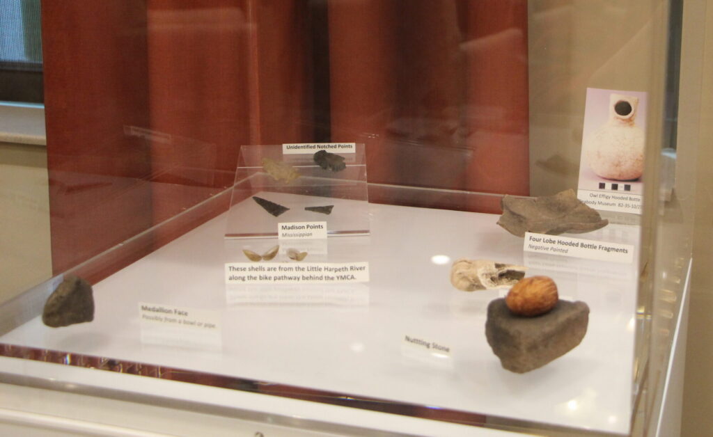 It might be easy to overlook something tucked into a display case in one of the meeting rooms. But the array of items — a tool to grind maize, a pottery shard, a whitetail deer bone, shells from the Harpeth River, a medallion face fragment, and arrowheads and knife points — serve as clues to what was once buried below: an entire Mississippian town.
