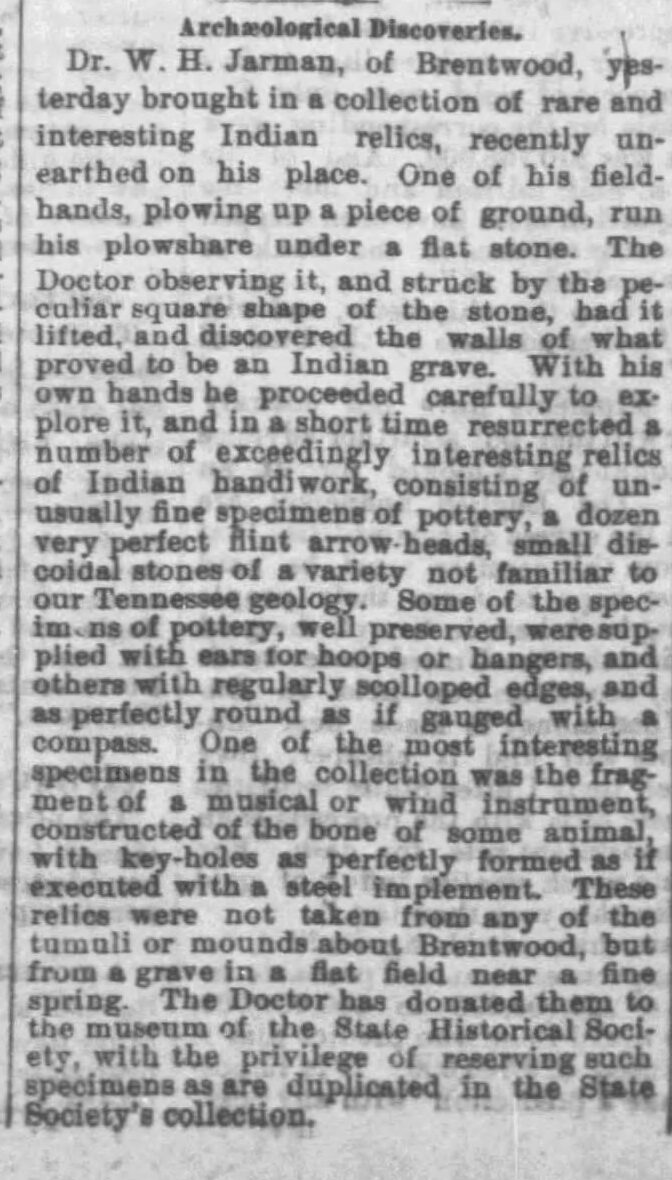 Jarman’s discoveries were detailed in local Nashville newspaper the Daily American in 1881.