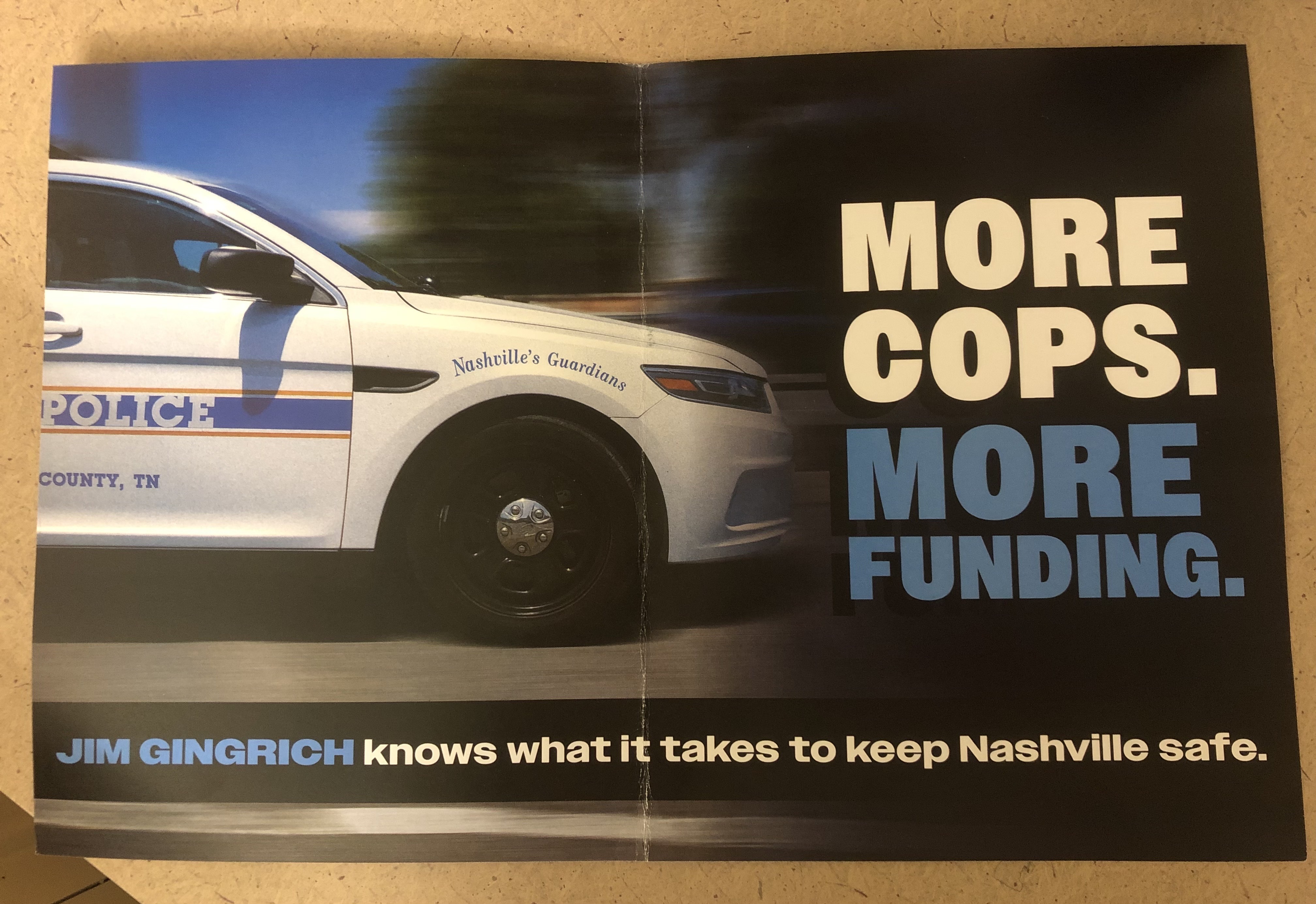 Jim Gingrich, who recently sent a campaign mailer with the slogan, “More cops, more funding. Jim Gingrich knows what it takes to keep Nashville safe,” has plans to hire additional police and equip them with “state-of-the-art equipment.”