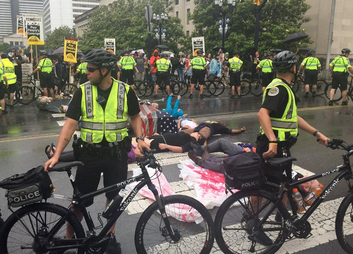 Just after 3 p.m., more than a dozen participants marched onto Charlotte Avenue and laid down in the middle of the street. After being warned by police that they’d be arrested unless they dispersed, officers took several into custody.