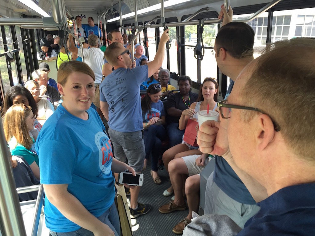 The group of about 30 residents of the Nations neighborhood began by boarding a city bus en masse a week ago — in matching bright blue shirts.
