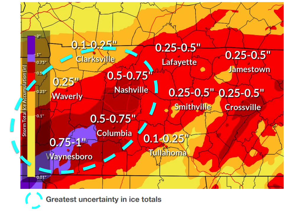 This map shows the National Weather Service forecast for ice accumulation in Middle Tennessee as of Friday morning.
