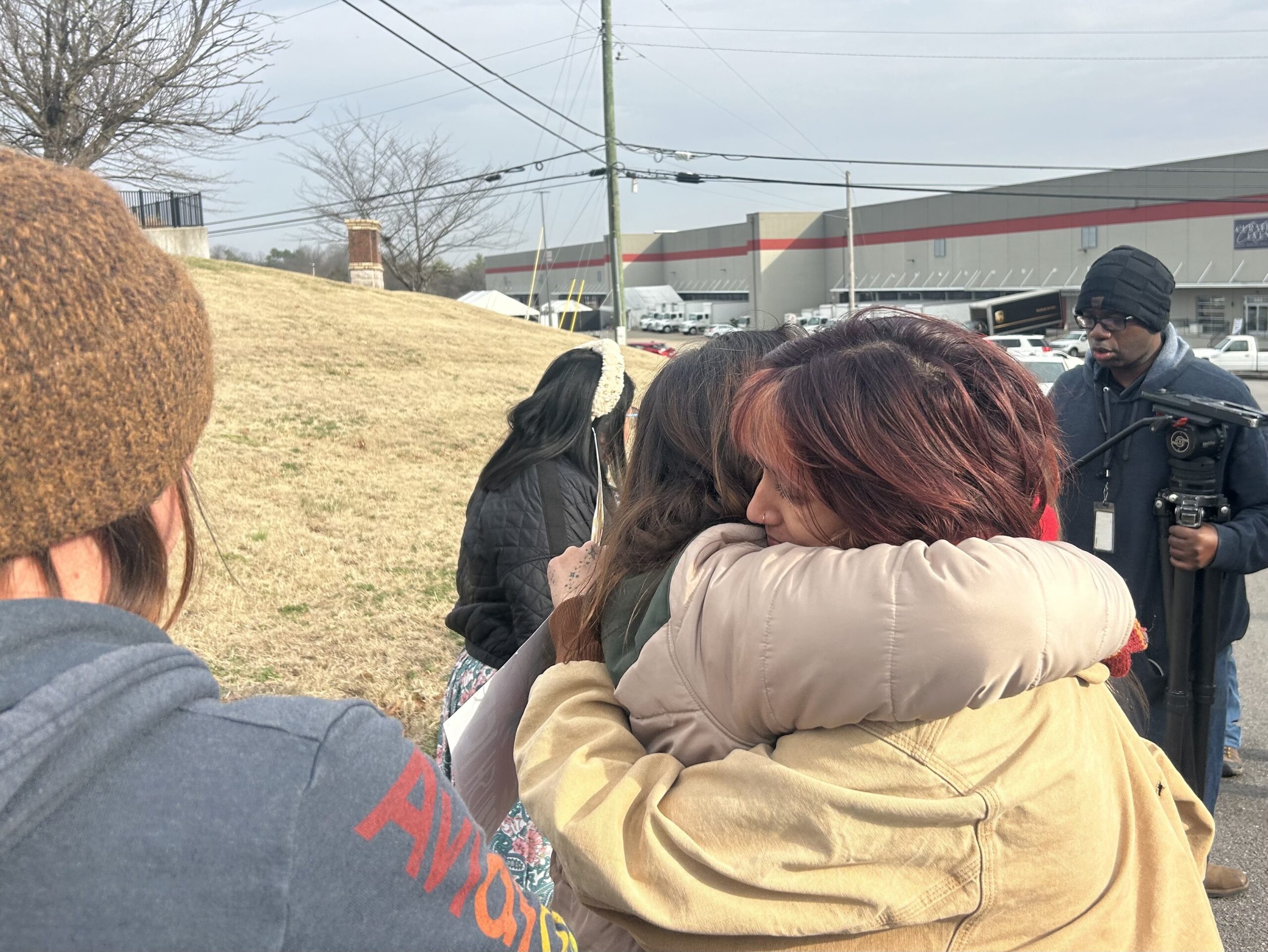 Rose Gilbert WPLN News Ashley Wargington (left), a volunteer with Music City Migra Watch, hugs one of the mourners at the vigil.