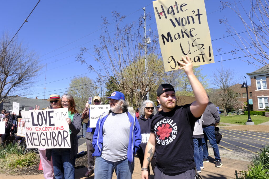 Caroline Eggers WPLN NewsPeople gathered in Ashland City, Tennessee to protest the Trump administration on March 28, 2026.