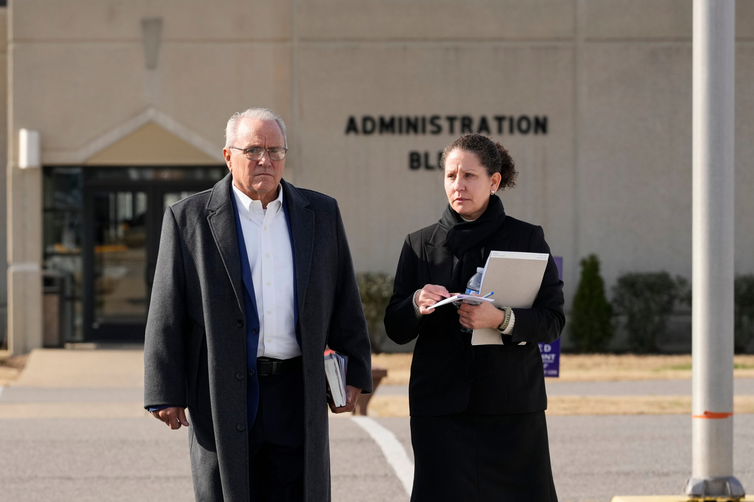 Spiritual advisor J.R. Davis, left, and attorney Deborah Drew, right, for Harold Wayne Nichols leave the administration building Riverbend Maximum Security Institution after the execution of Nichols, Thursday, Dec. 11, 2025, in Nashville, Tenn. (AP Photo/George Walker IV)