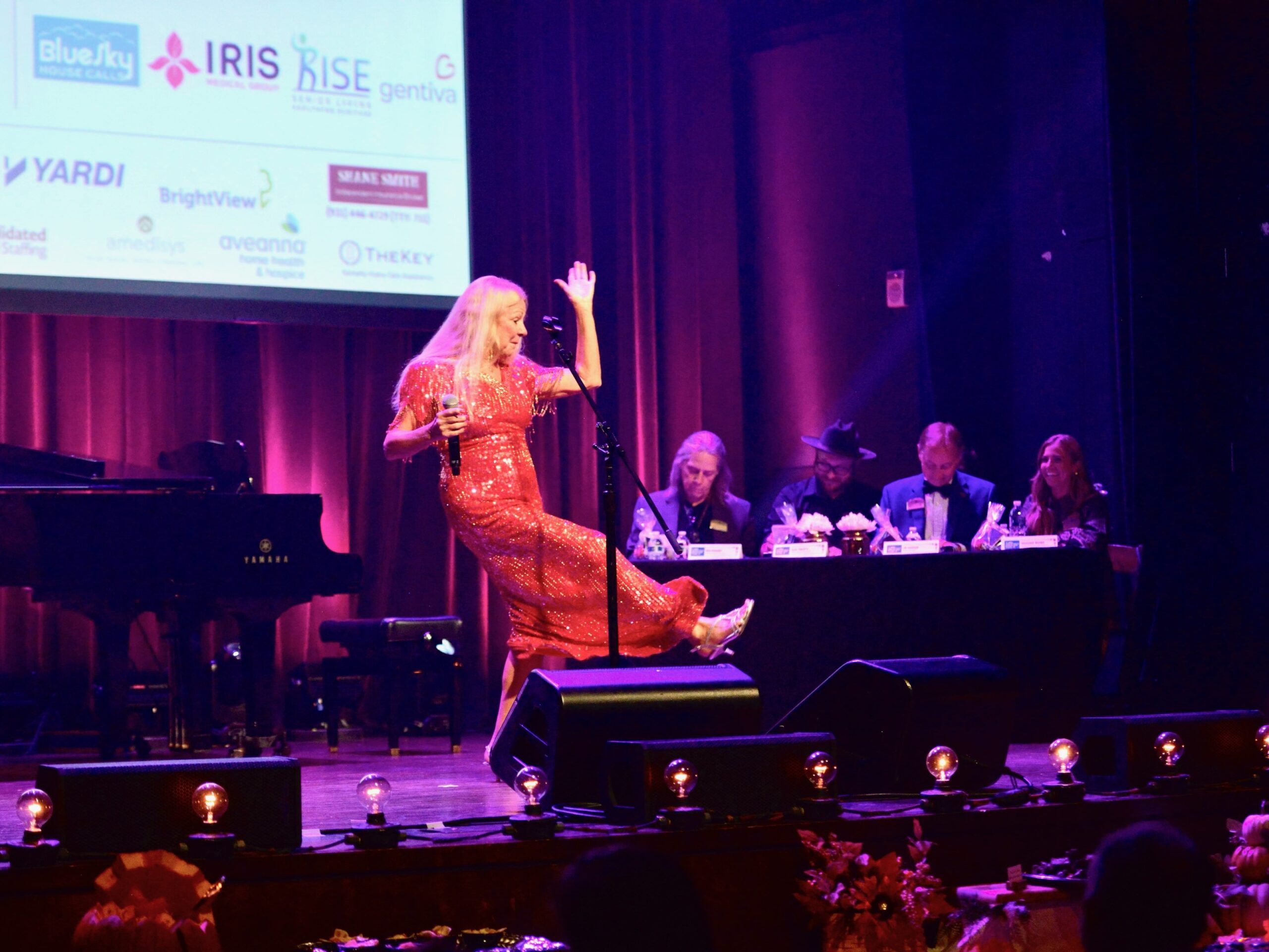 The event is a moment to feature talented older adults, yes, but it’s also an opportunity for the organization to raise awareness and funds for their nurse scholarship program. Miranda Perez, executive director for the Morning Pointe Foundation, talks about the worldwide nurse shortage and tells the crowd that by the year 2030, there will be 20 patients to one nurse.
