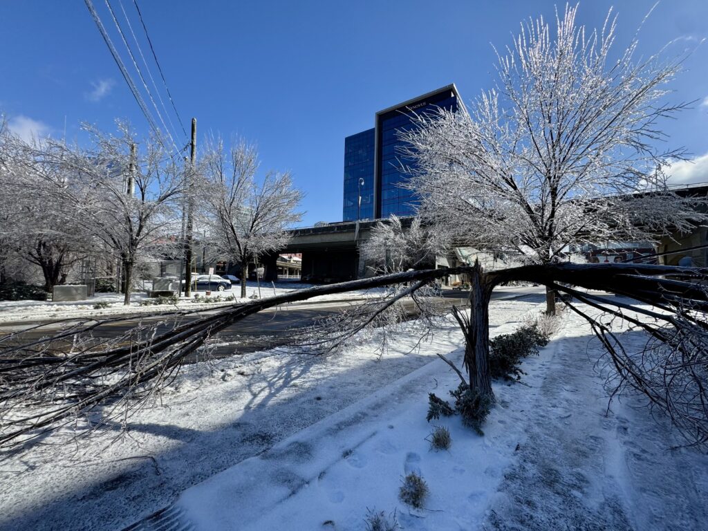 Caroline Eggers WPLN NewsA tree spills onto a road in downtown Nashville on January 26, 2026.