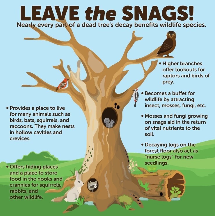 Hundreds of birds, mammals, reptiles and amphibians visit tree snags for food foraging, nesting and roosting.