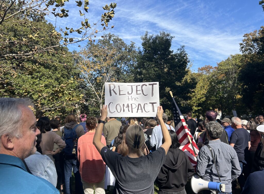 Protestors held signs reading “Reject the Compact,” “Protect International Students,” and “Black and Gold, not Red Tape,” referring to the school’s colors. Some carried American flags, and at least two students came with laptops so they could participate while finishing up their school work.