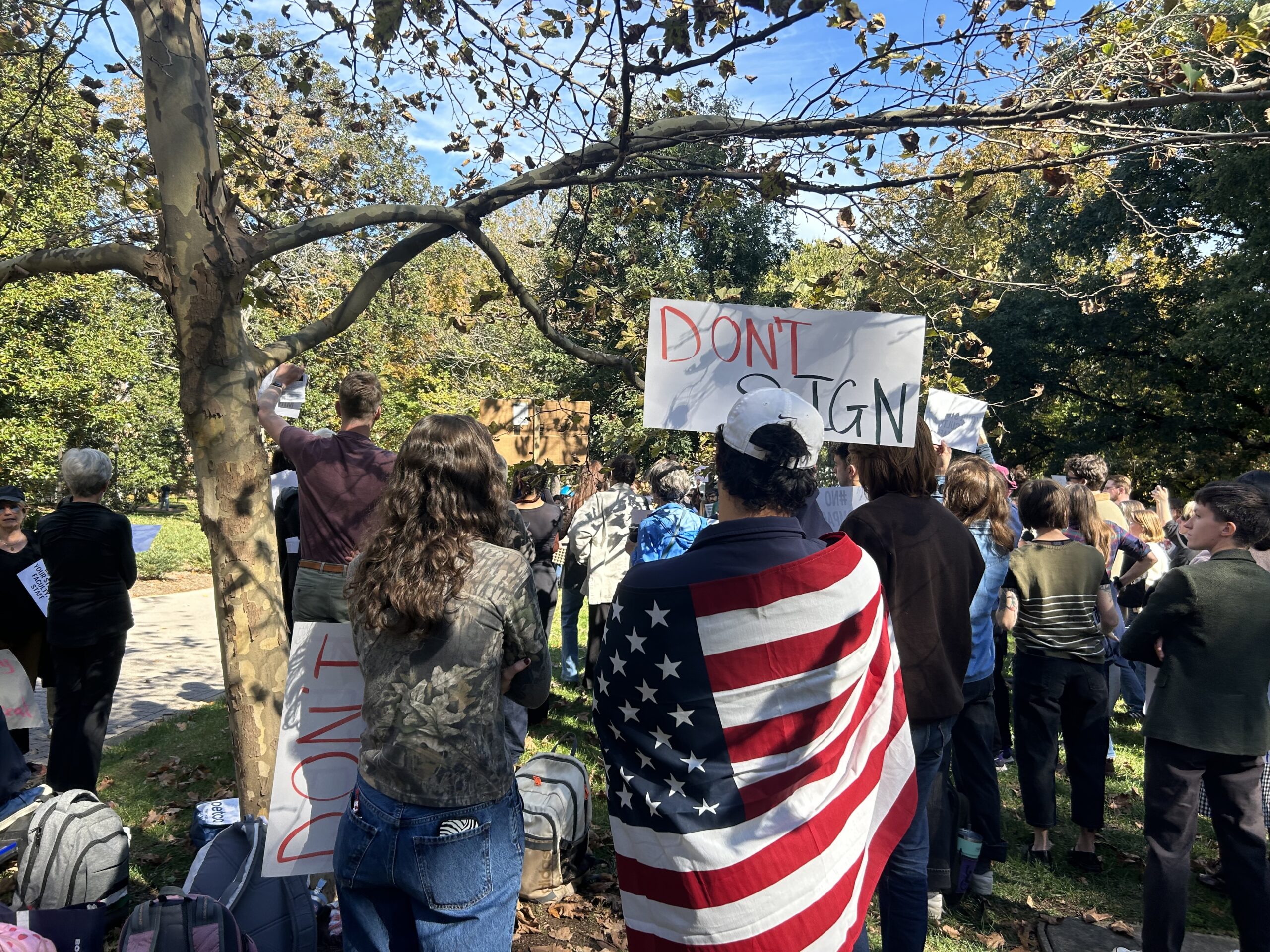 Protestors held signs reading “Reject the Compact,” “Protect International Students,” and “Black and Gold, not Red Tape,” referring to the school’s colors. Some carried American flags, and at least two students came with laptops so they could participate while finishing up their school work.